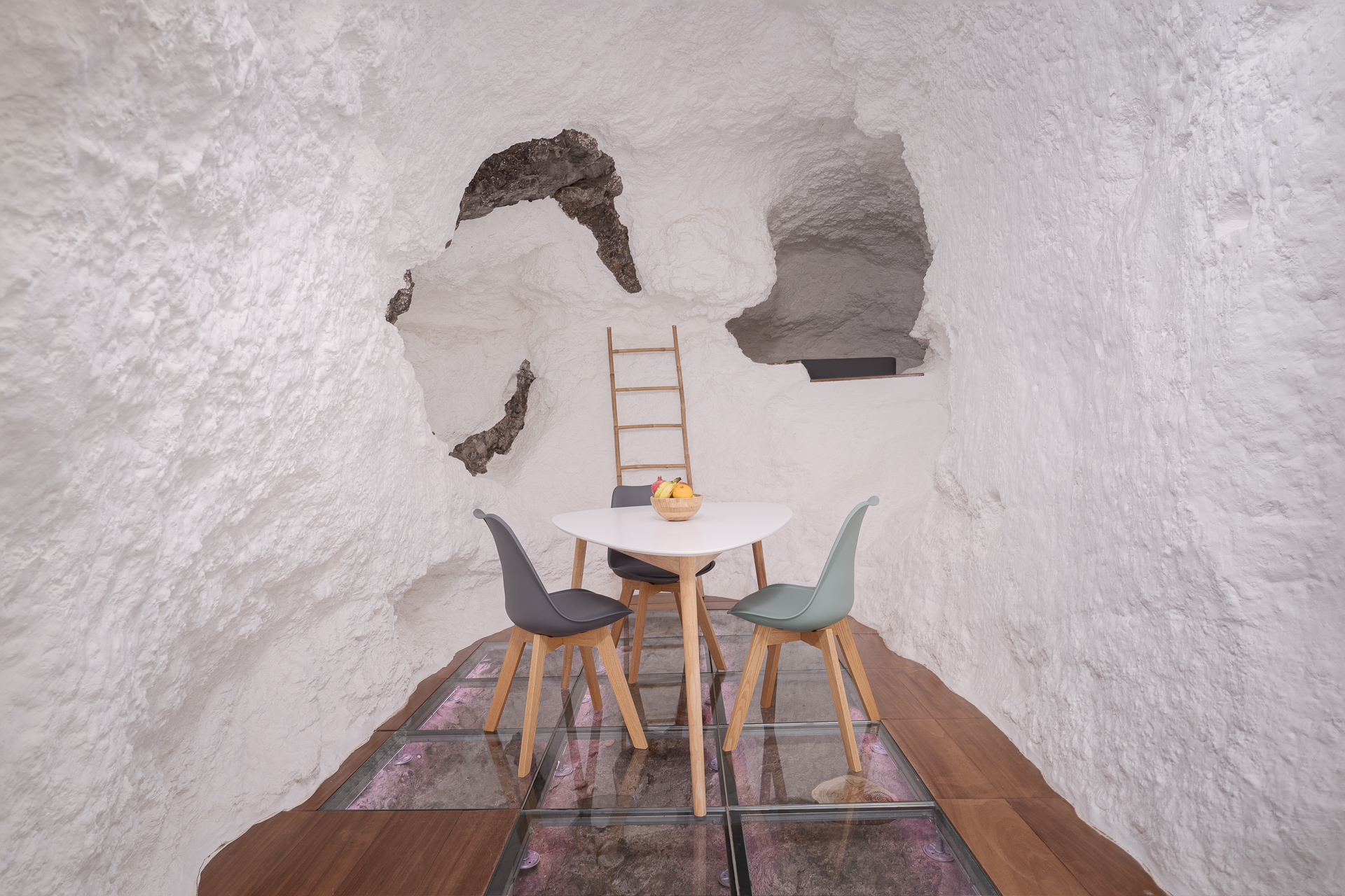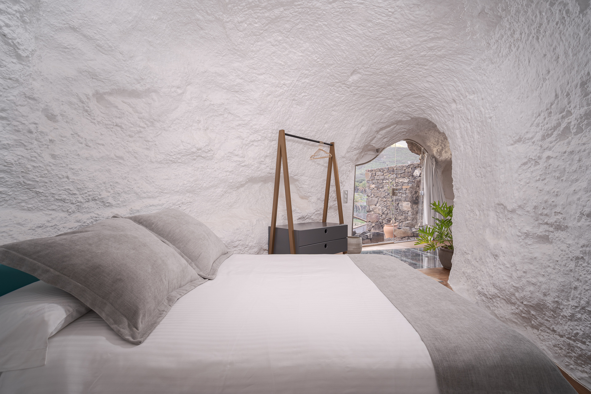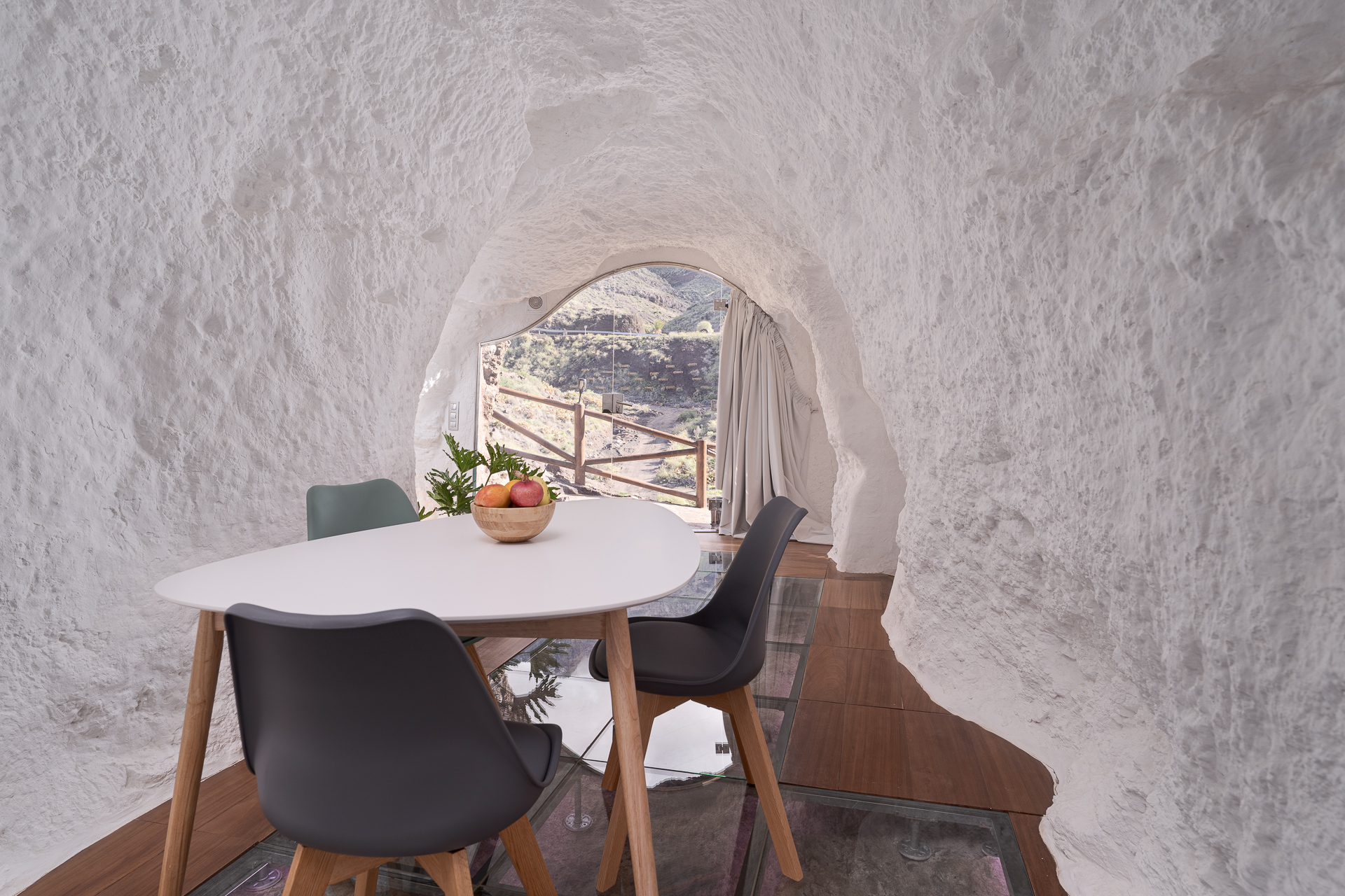 Das Innere verbindet Geschichte und Moderne. Es besticht durch einen Glasboden, der den ursprünglichen Fels der Höhle freigibt, sowie durch ein Lichtspiel, das eine einhüllende Atmosphäre schafft. Auf der privaten Terrasse mit Chill-out-Bereich scheint die Zeit stillzustehen, während Sie die Meeresbrise und unvergessliche Sonnenuntergänge in einer Umgebung genießen, die für den indigenen Adel geschaffen scheint.
