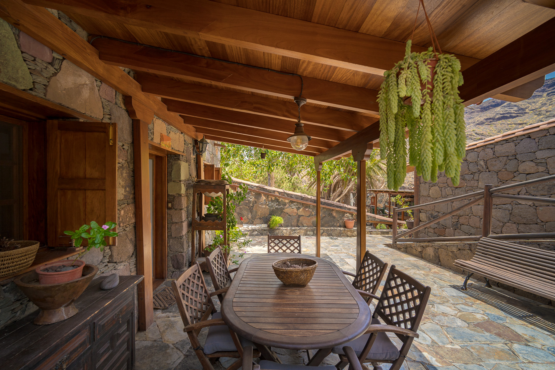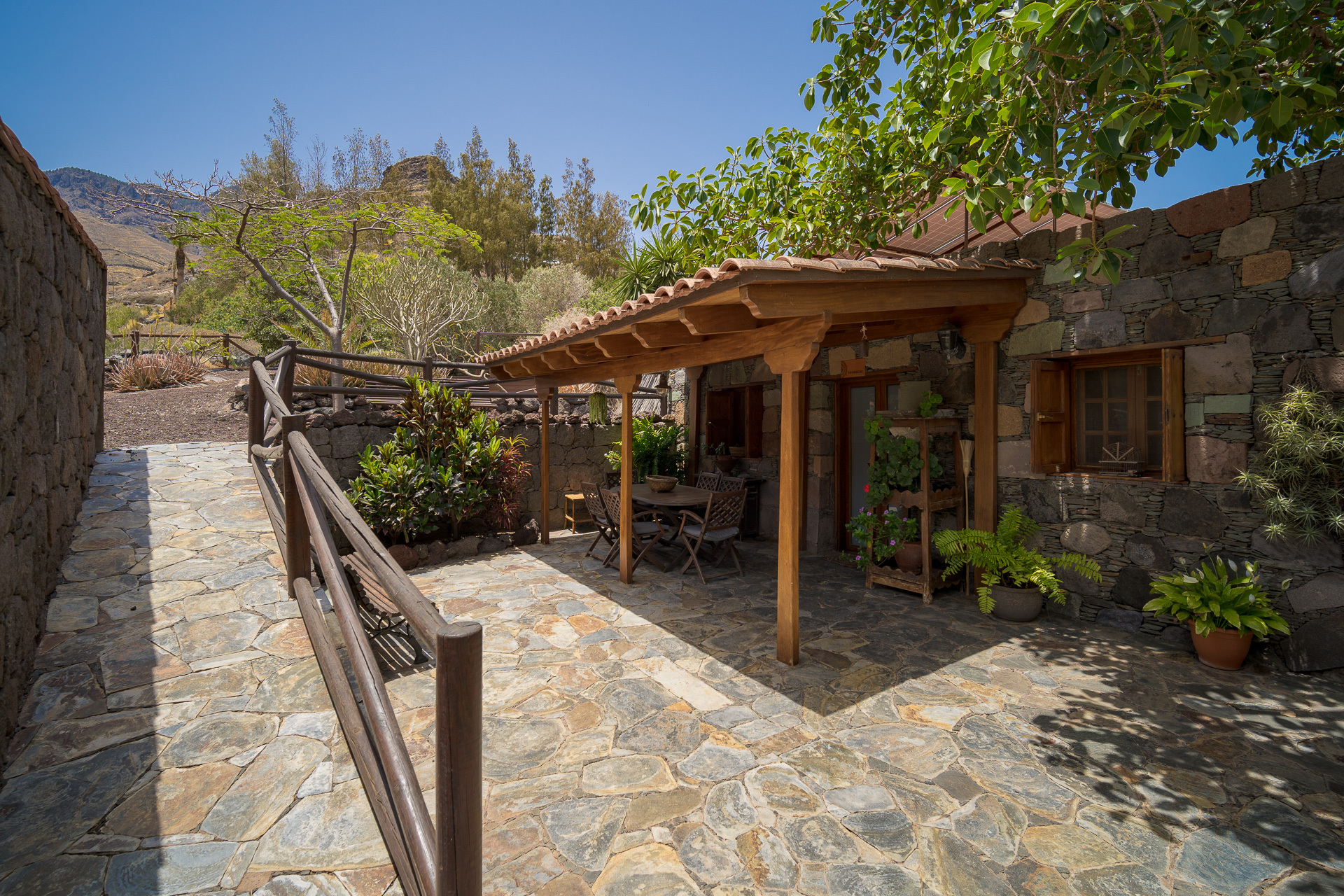 Sur la terrasse, les branches d'un grand ficus tombent devant la maison et couvrent le porche de l'agréable espace extérieur. Vous bénéficierez d'une vue magnifique sur le massif de Tamadaba et pourrez admirer de belles plantes de jardin.