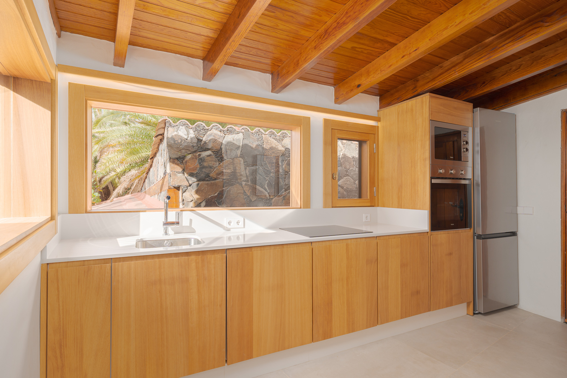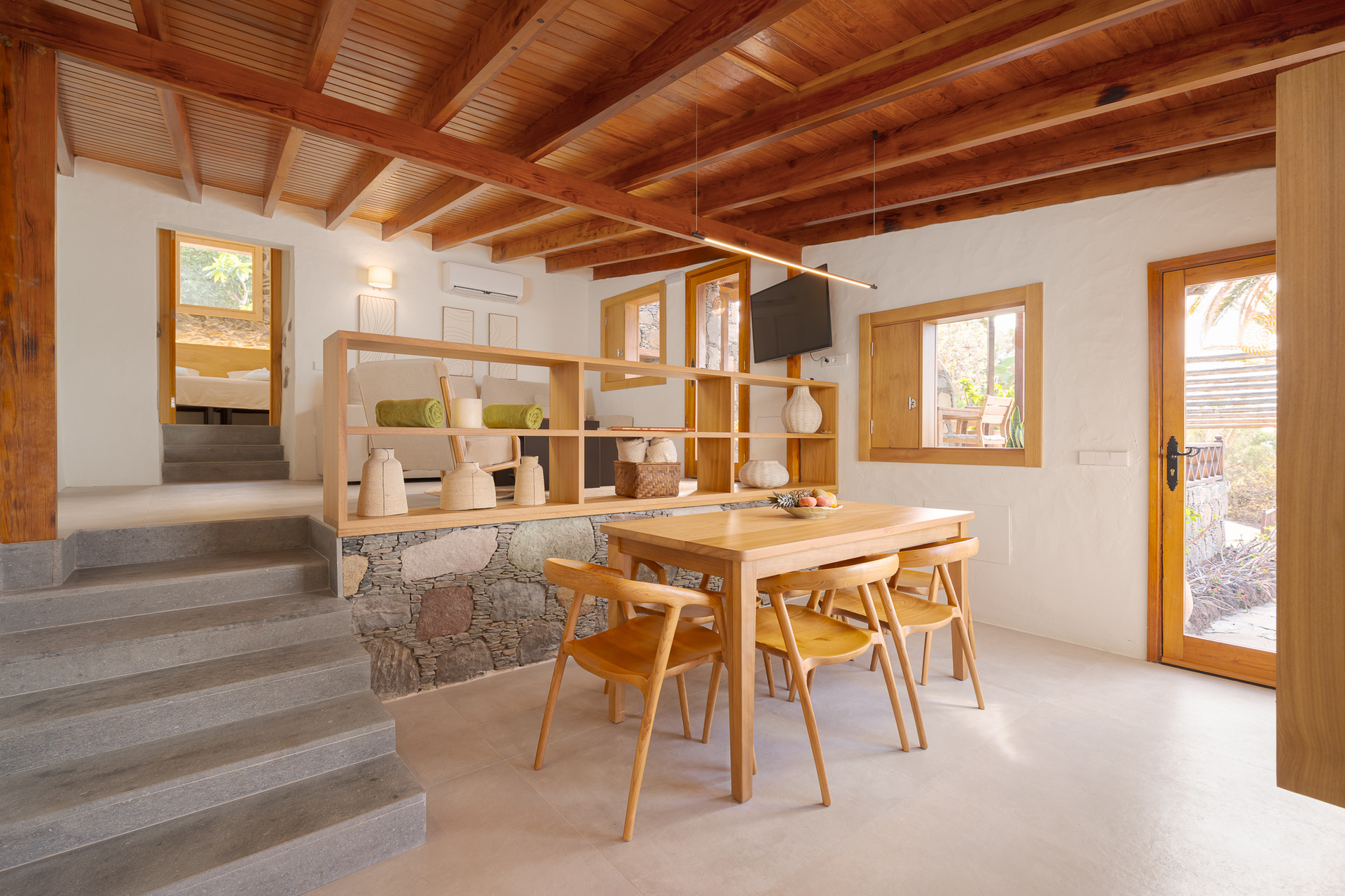 La chaleur du bois qui enveloppe la maison et son salon à deux niveaux crée une atmosphère chaleureuse et rustique, en harmonie avec l'environnement naturel environnant. Depuis la terrasse, vous pourrez profiter de la nature et du climat canarien, bercé par le bruit apaisant des vagues et des couchers de soleil impressionnants.